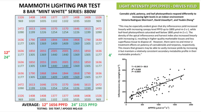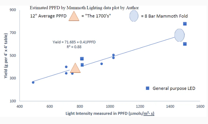 The positive, apparently linear relationship between intensity and yields continues to at least 1500 µmols/m2· s, which is over twice the level provided by an HPS fixture in a grow configuration, which is currently the industry standard.