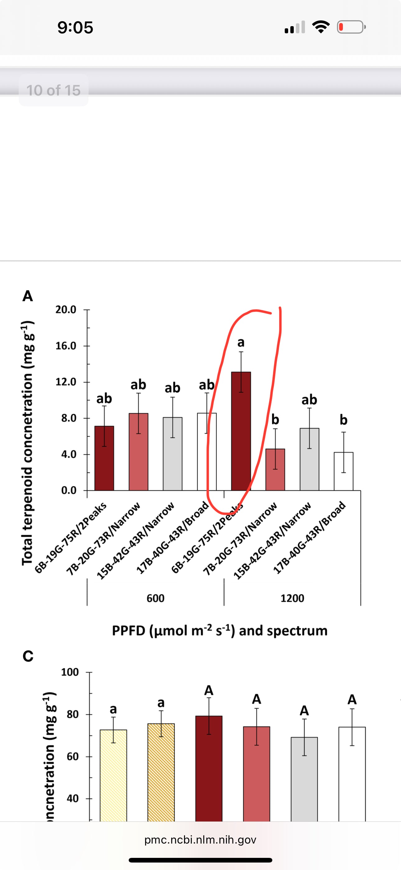 "White light with a dual red peak at 640 and 660 nm, compared to white light with a single red peak at 660 nm, increased inflorescence yield and light use efficiency, regardless of PPFD....at higher PPFD, white light with a dual red peak of 640 and 660nm compared to white light with a single red peak at 660 nm increased terpenoidconcentrations." Front Plant Sci. 2024 Jun 18
